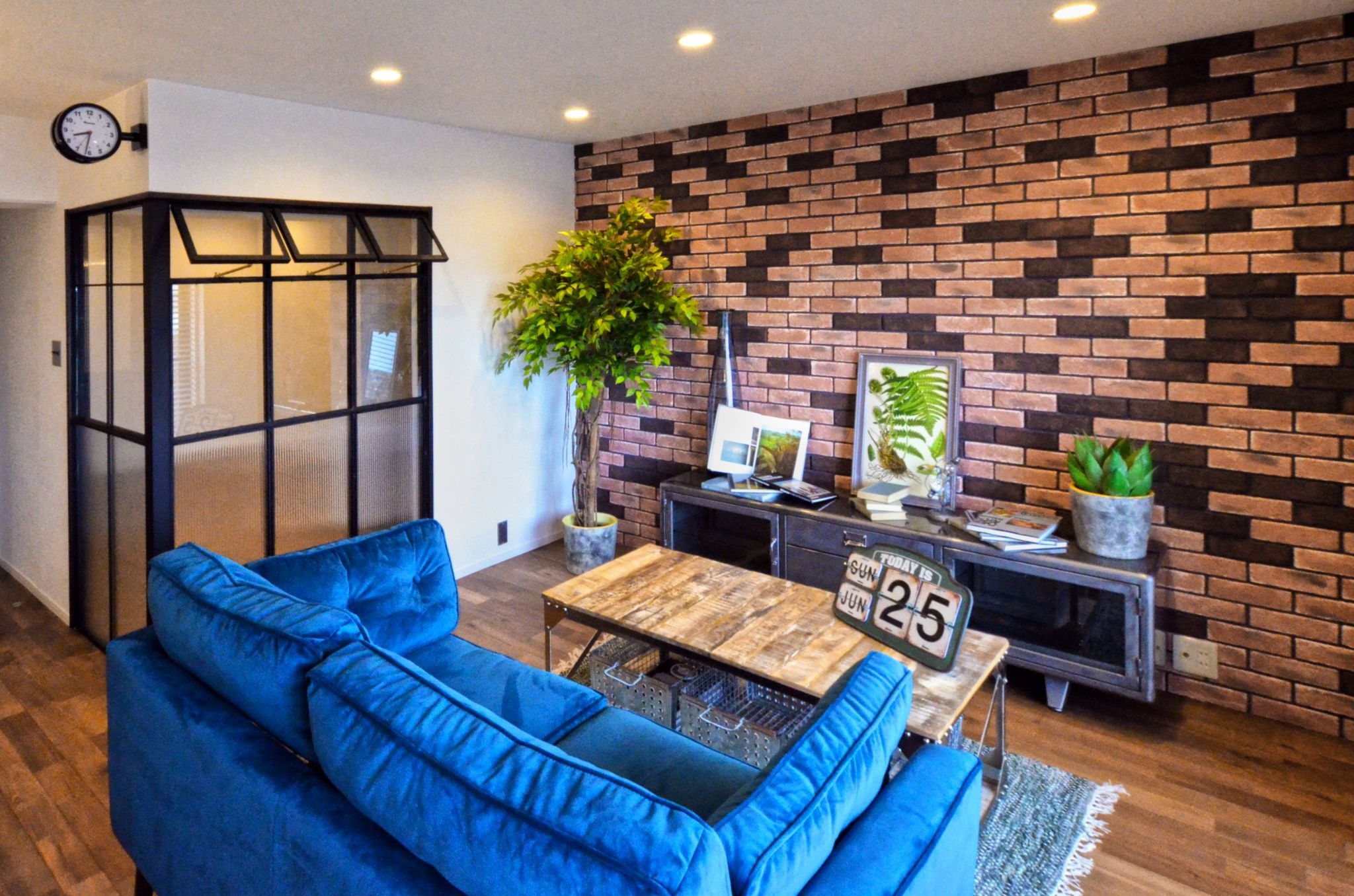 男前なインテリアに合わせ、存在感のある大型観葉植物を。