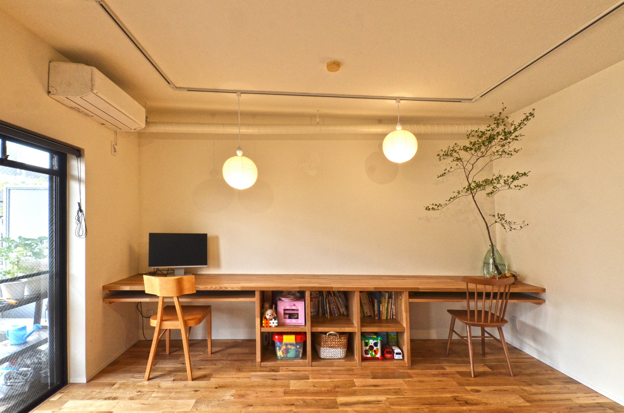 ガラスベースに生けられた枝もので、繊細に広がる枝振りと、小さく可愛らしい葉が特徴です。涼しげで清潔感のある佇まいは、こうしたナチュラルなワークスペースやキッズコーナーのアクセントとして非常に人気があります。